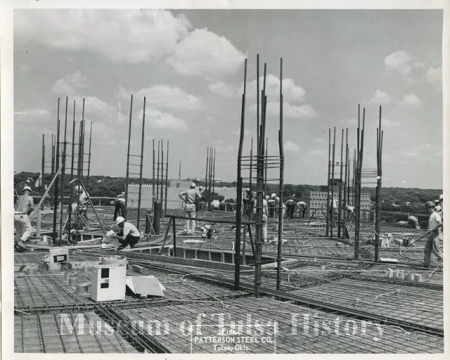 Black and white photo of construction workers building the University Club Tower in Tulsa, Oklahoma, showing steel rebar and early framework on a high-rise platform.