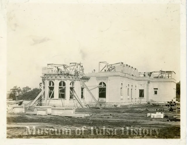 Rare photograph of the David R. Travis Mansion under construction in 1920. Now home to the Tulsa Garden Center, this historic Tulsa landmark showcases early 20th-century classical architecture tied to Tulsa’s oil boom heritage.